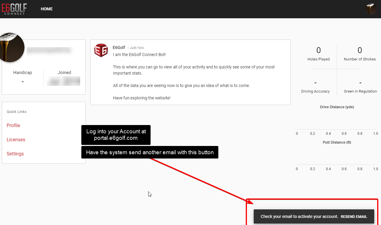 Resend Activation Email Missing the E6 Activation. Not seeing your E6 Connect license. Unable to Login to E6 Connect 1. Go to portal.E6golf.com 2. Click on the “ Resend Email ” Box in the bottom right of the screen to resend the activation email.