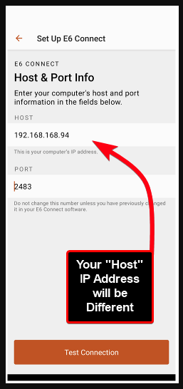 When on the “Host & Port Info” and/or the “Test Connection” Screen of the Android App