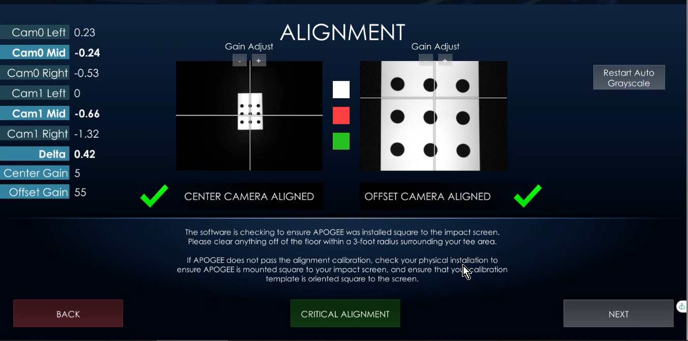 If the Gain is to low such as 5 or 10 and causing issue with ball flight repeat the calibration but manually adjust using the +- above the image. Try to set for 15-30 gain and test.